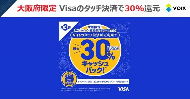 12月3日スタート!大阪限定Visaキャンペーンでお得に楽しむ方法 2024年12月02日 カテゴリ:情報 このキャンペーンは、大阪在住の方や訪れる方にとってお得情報です。Visaを利用して得られるキャッシュバックは、次回の買い物の足しにもなりますし、タッチ決済の手軽さもあって、ますますお得感を感じられそうです!<関連する記事> 「Visa割」登録カード利用で、30%キャッシュバック!『大阪限定 Visaのタッチ決済キャッシュバックキャンペーン 第4弾』を12月3日より開始 | ビザ・ワールドワイド・ジャパン株式会社のプレスリリース - PR TIMES (出典:PR TIMES) <関連する画像> (出典 voix.jp) (出典 www.visa.co.jp) <関連する動画> <ツイッターの反応> 「情報」カテゴリの最新記事 コメントする コメントフォーム 名前 コメント 記事の評価 リセット リセット 顔 星 情報を記憶 コメントを投稿する