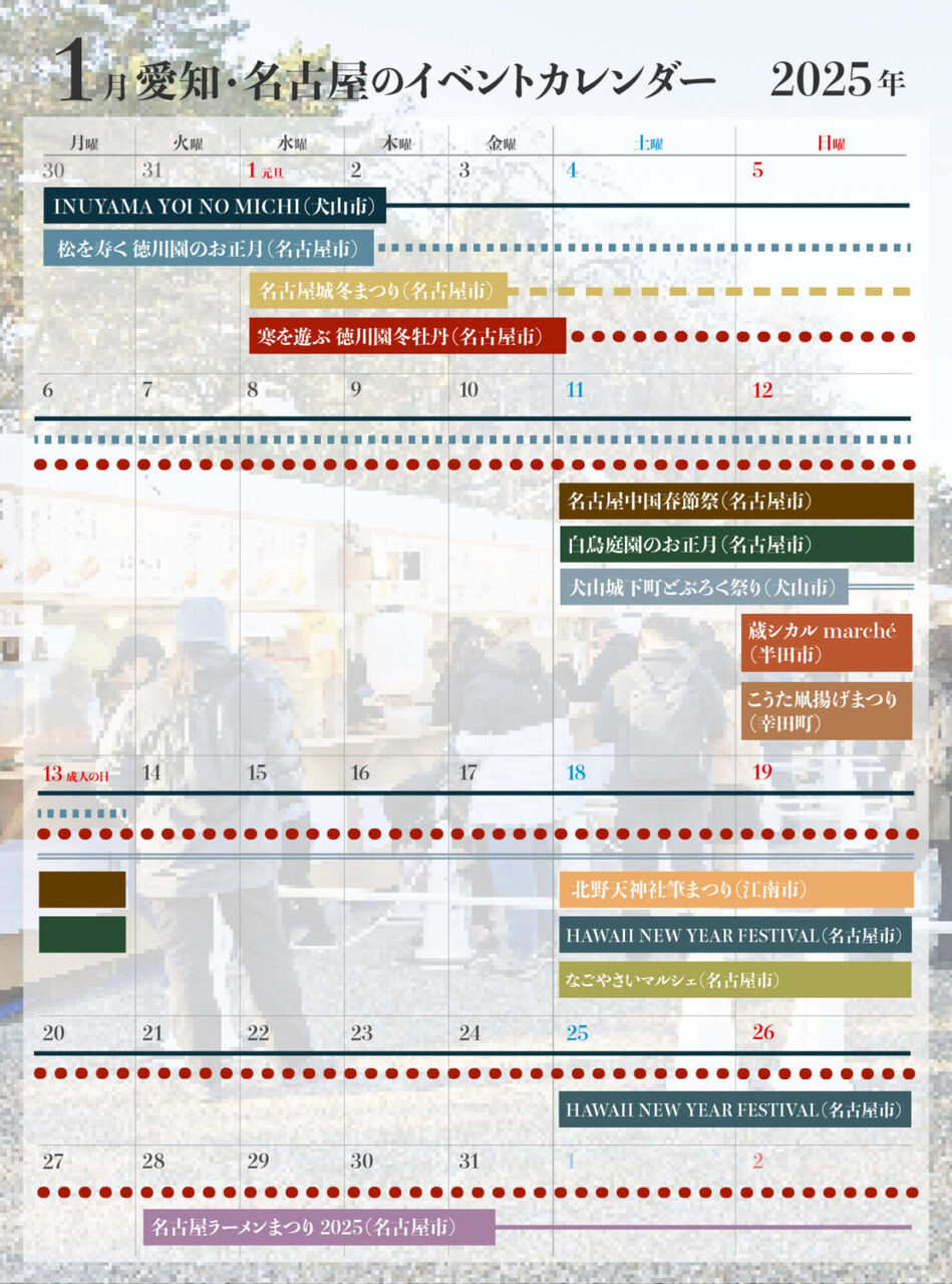 2025年お正月休みに愛知で楽しむ無料イベント7選 2024年12月31日 カテゴリ:イベント 愛知県が提供する新年のイベントは、子どもたちにとって楽しい体験がたくさん詰まっています。親子で参加できるアクティビティが予定されていて、お正月を家族で満喫できる絶好のチャンス。2025年のお正月は、これらのイベントで特別な時間を過ごしてみてはいかがでしょうか。<関連する記事> 【愛知】2025年始(お正月休み)に楽しめるイベント7選 無料イベントも! - いこレポ | 子どもが喜ぶ遊び場・おでかけガイド (出典:いこレポ | 子どもが喜ぶ遊び場・おでかけガイド) <関連する画像> (出典 www.tabemaro.jp) (出典 www.tabemaro.jp) (出典 www.tabemaro.jp) <関連する動画> 日テレNEWS - YouTube 日テレNEWS - YouTube <ツイッターの反応> 「イベント」カテゴリの最新記事 コメントする コメントフォーム 名前 コメント 記事の評価 リセット リセット 顔 星 情報を記憶 コメントを投稿する